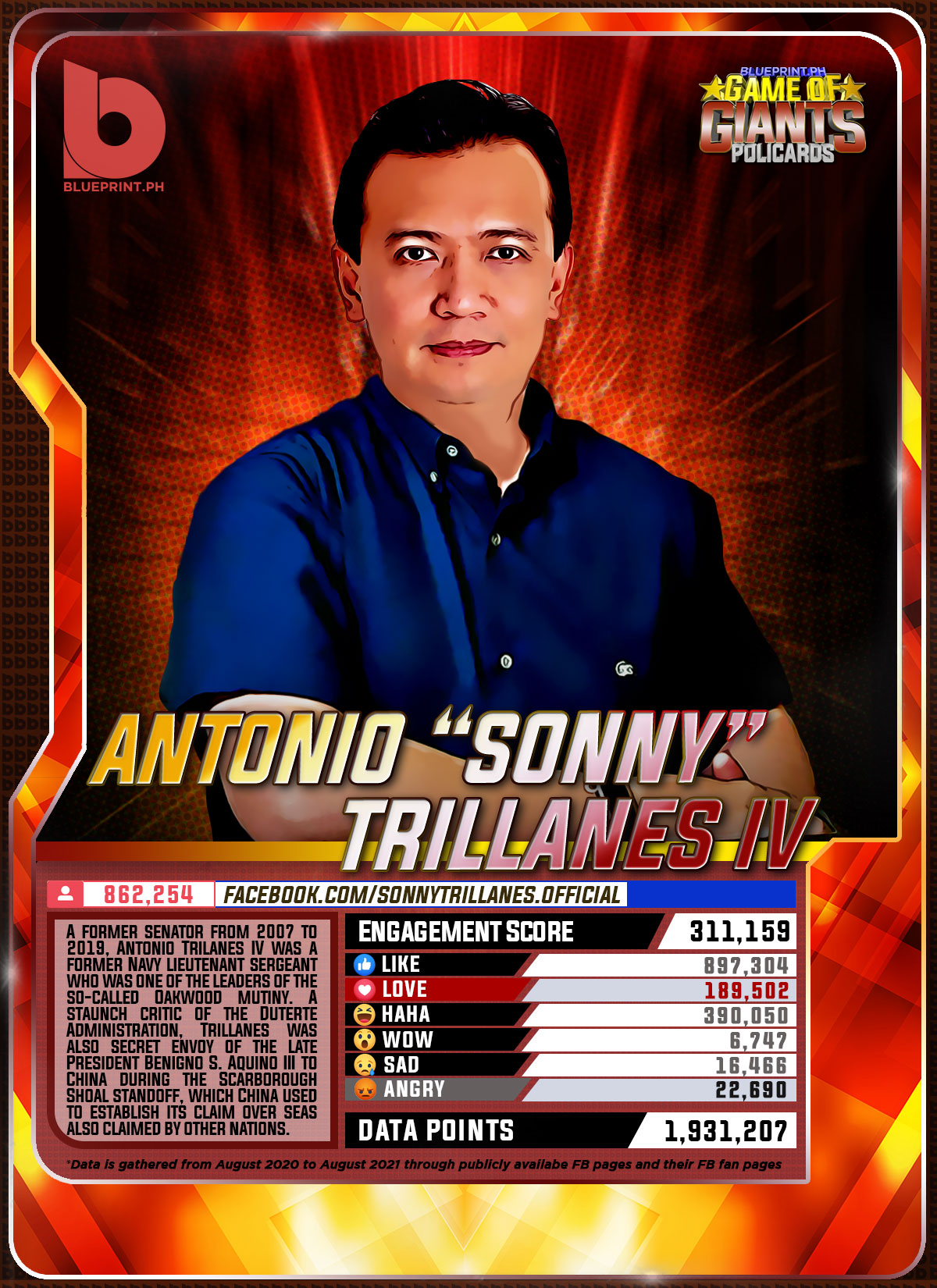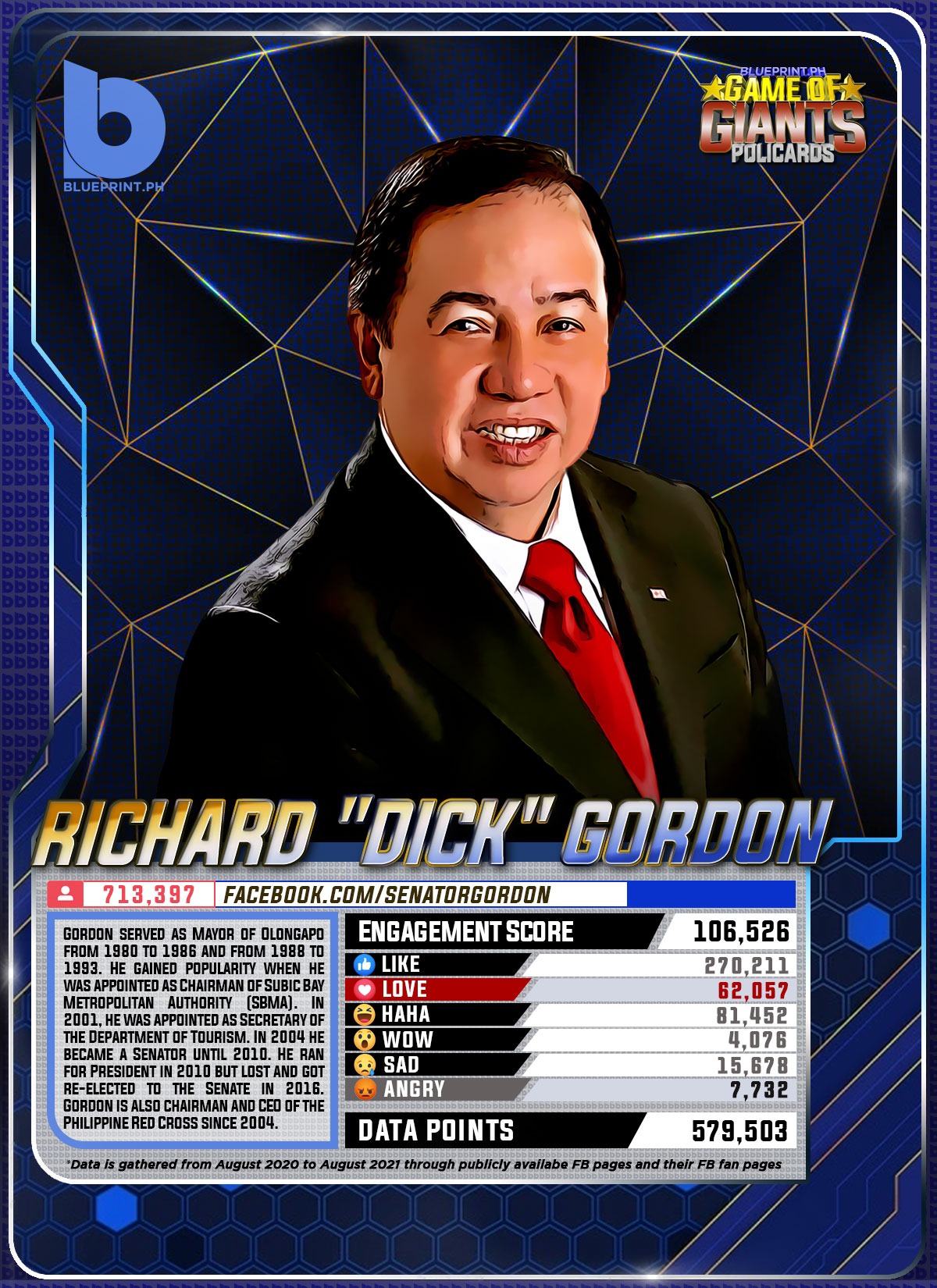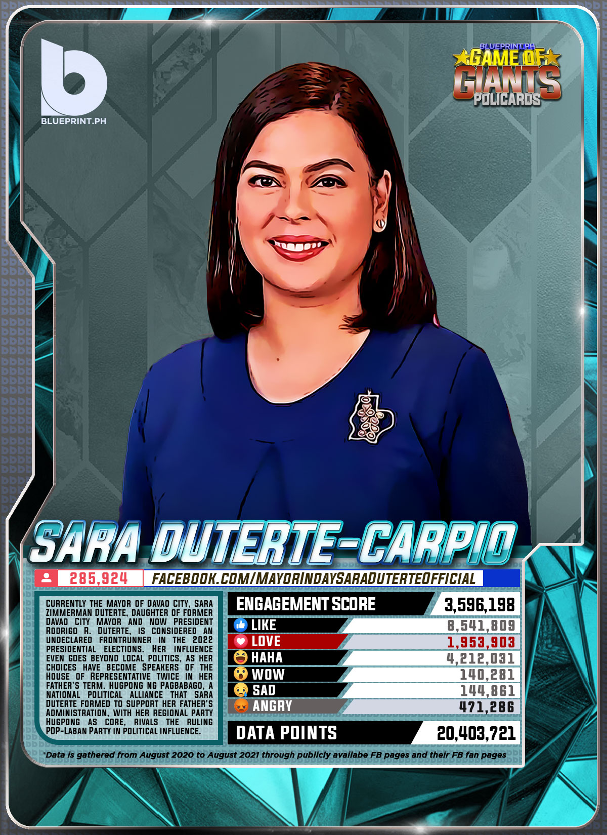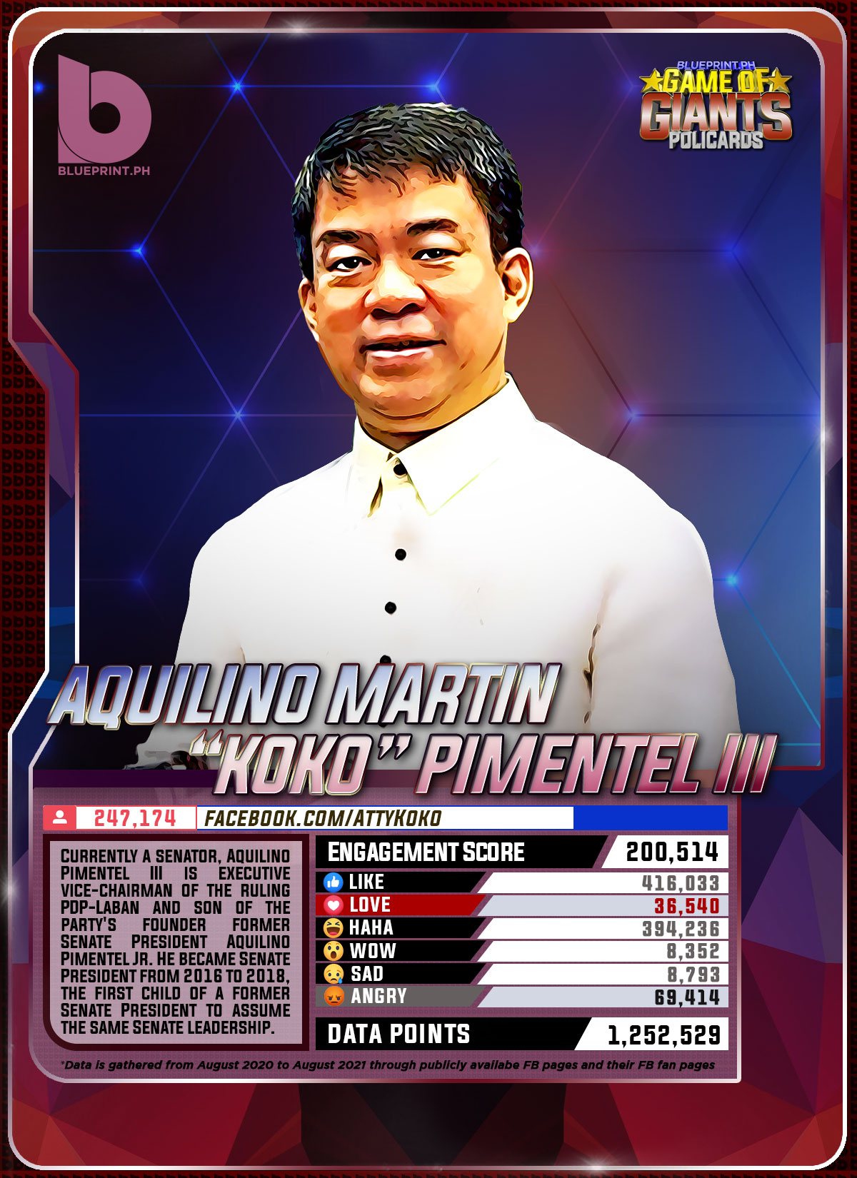Using data from Filipinos' engagement in Facebook, we can now gauge public sentiment on issues and personalities,as shown by the big data analytics that political PR firm BluePrint.PH does regularly. And using that data, BluePrint.PH came up with a "policard" much like a baseball or an NBA card that shows sports players' scores, details about their life and other information which their fans can exchange. The cards themselves show public sentiment as measured through Filipinos' reaction to posts about them. To be updated every month, the prominent politicians can now be measured through the movement of n their social media engagement score.
