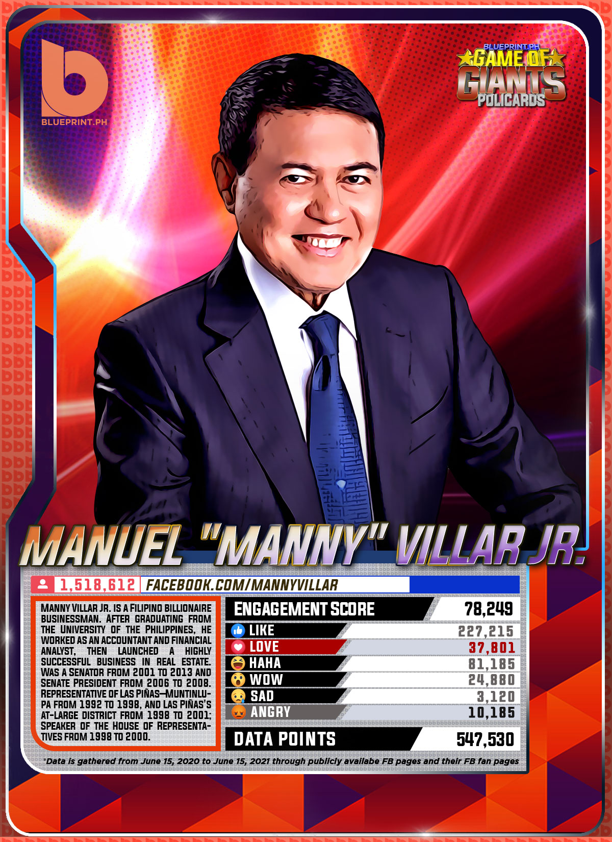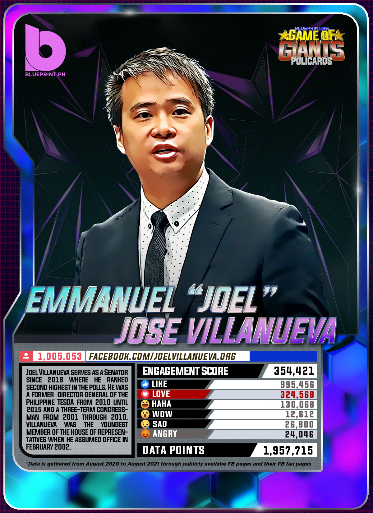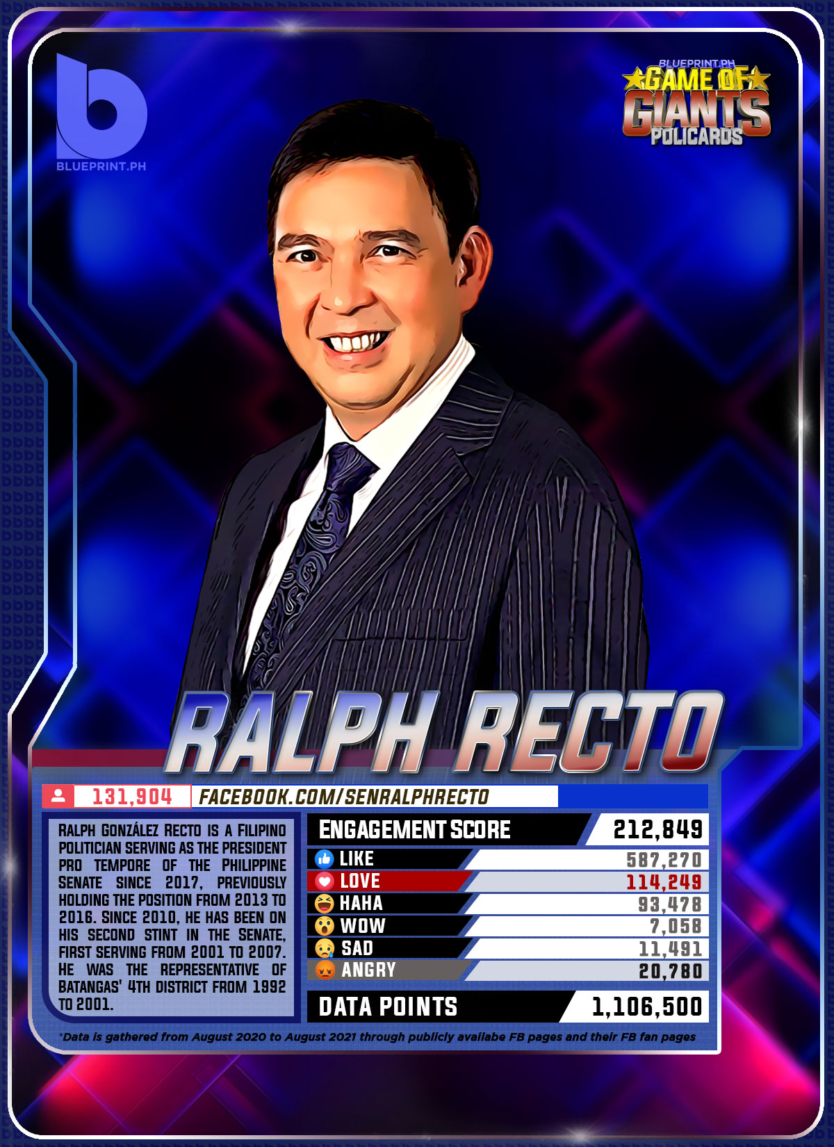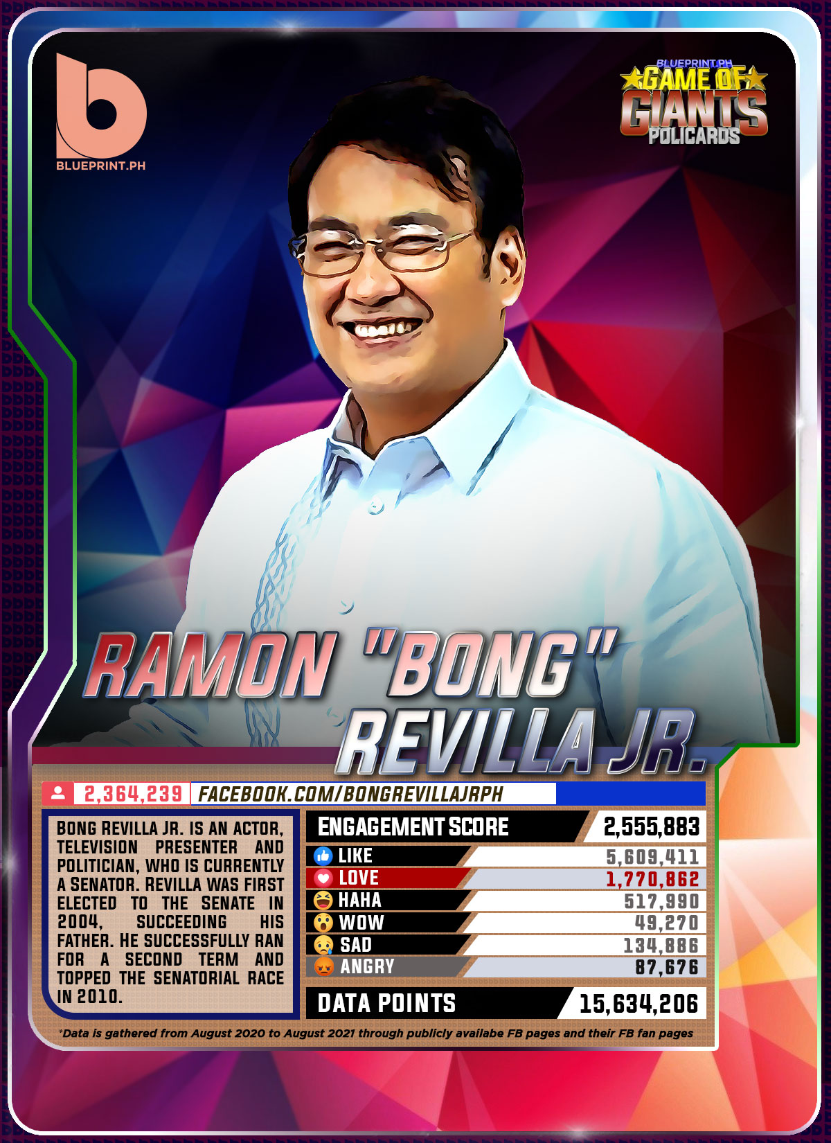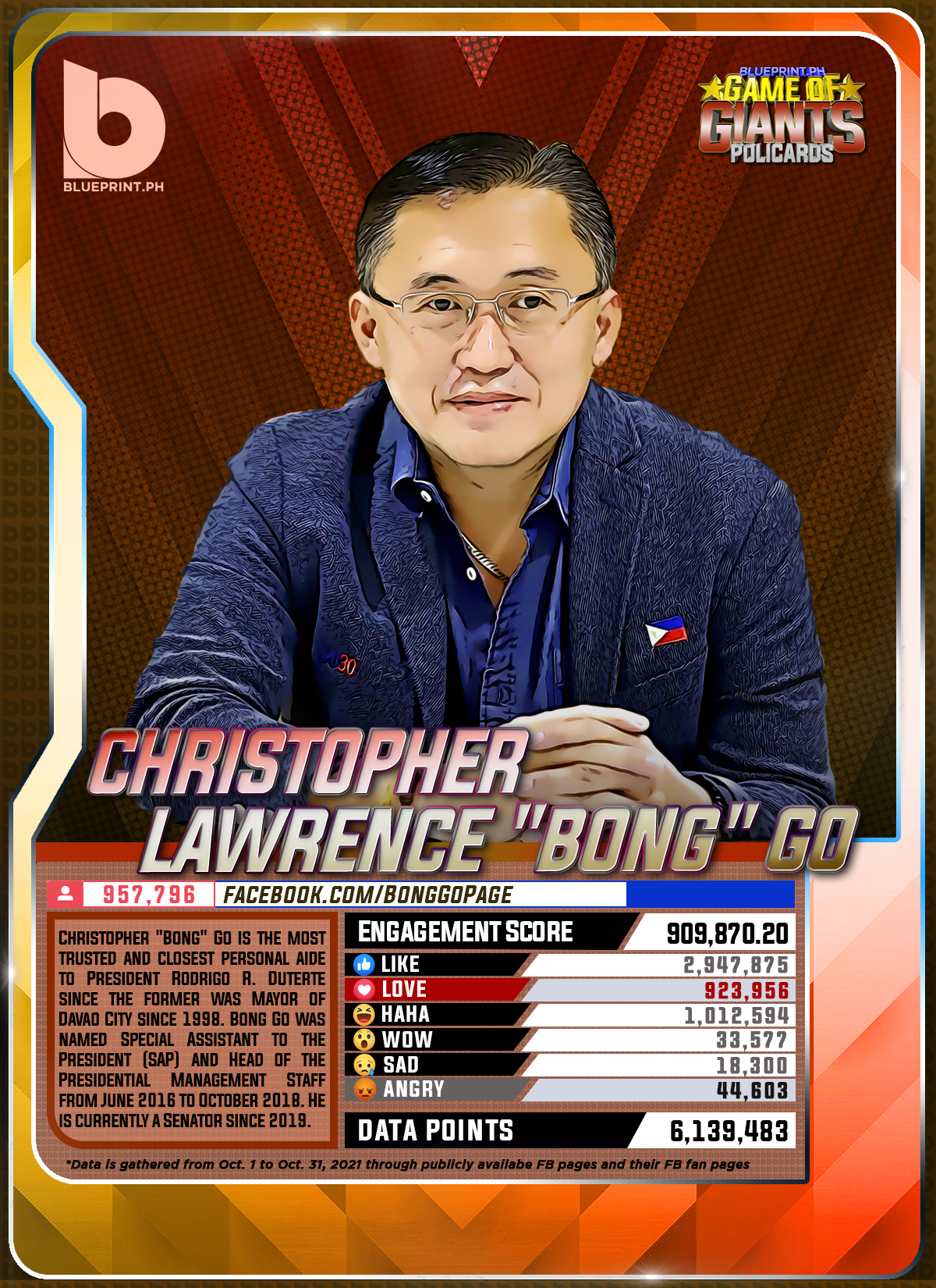 Using data from Filipinos' engagement in Facebook, we can now gauge public sentiment on issues and personalities,as shown by the big data analytics that political PR firm BluePrint.PH does regularly. And using that data, BluePrint.PH came up with a "policard" much like a baseball or an NBA card that shows sports players' scores, details about their life and other information which their fans can exchange. The cards themselves show public sentiment as measured through Filipinos' reaction to posts about them. To be updated every month, the prominent politicians can now be measured through the movement of n their social media engagement score.