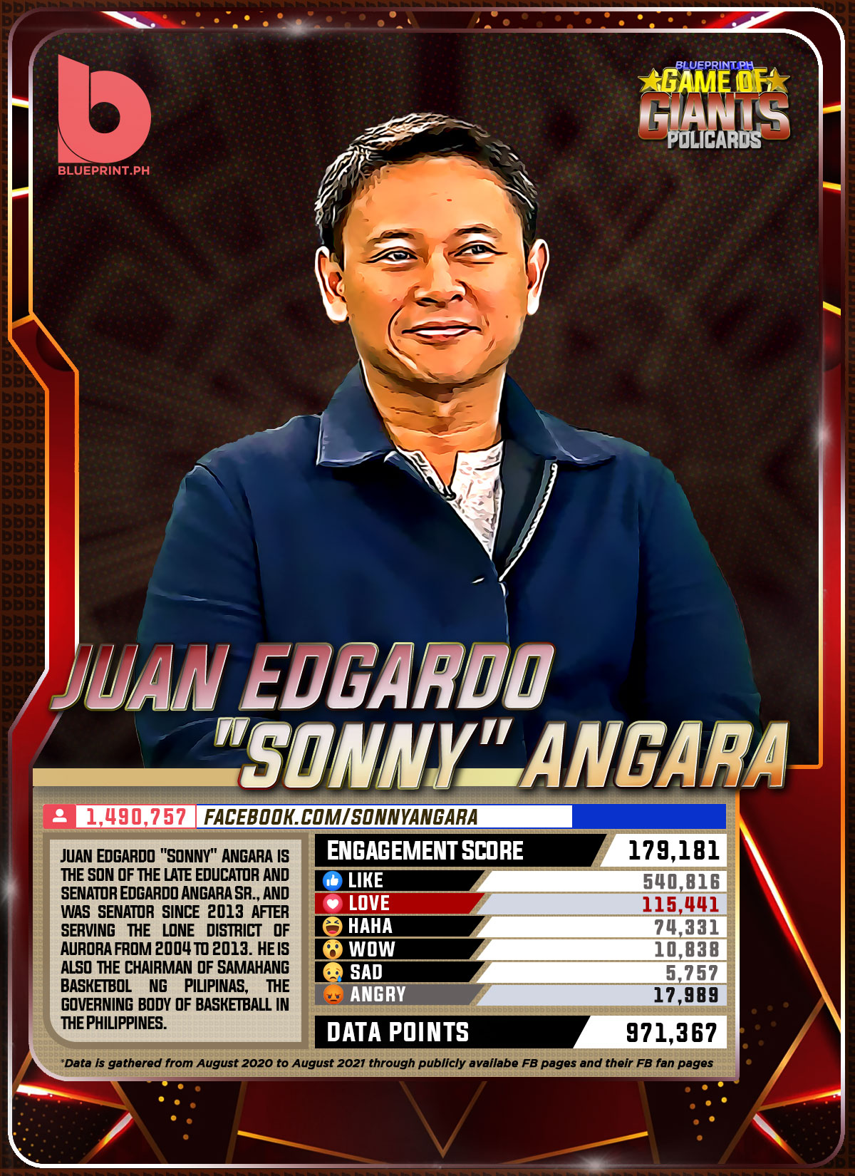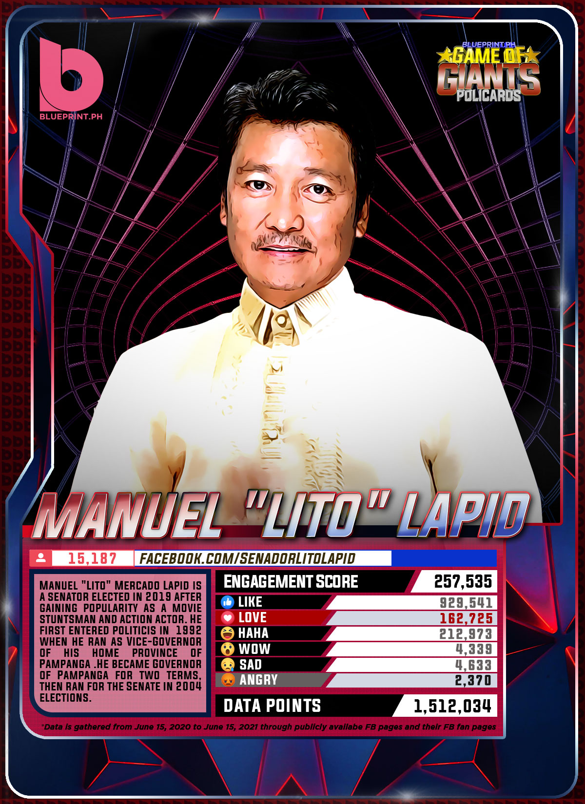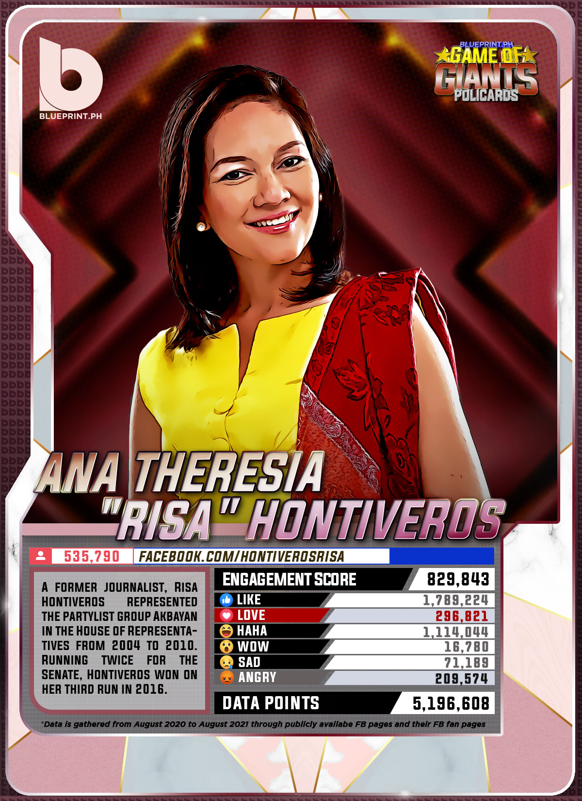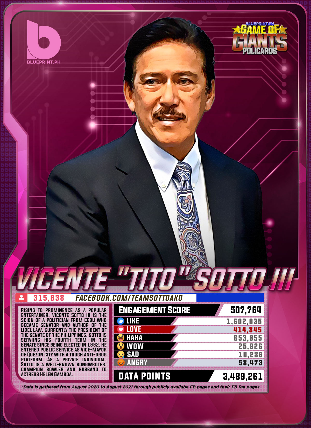 Using data from Filipinos' engagement in Facebook, we can now gauge public sentiment on issues and personalities,as shown by the big data analytics that political PR firm BluePrint.PH does regularly. And using that data, BluePrint.PH came up with a "policard" much like a baseball or an NBA card that shows sports players' scores, details about their life and other information which their fans can exchange. The cards themselves show public sentiment as measured through Filipinos' reaction to posts about them. To be updated every month, the prominent politicians can now be measured through the movement of n their social media engagement score.