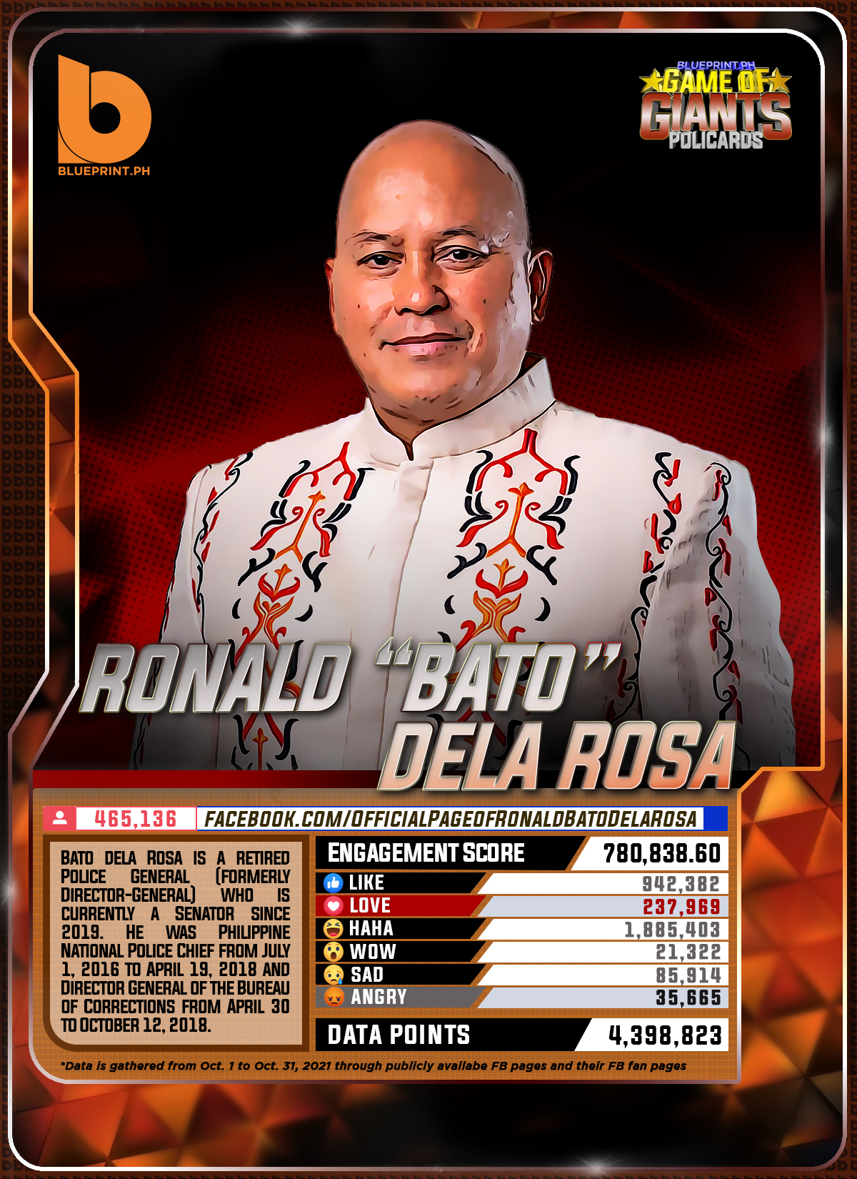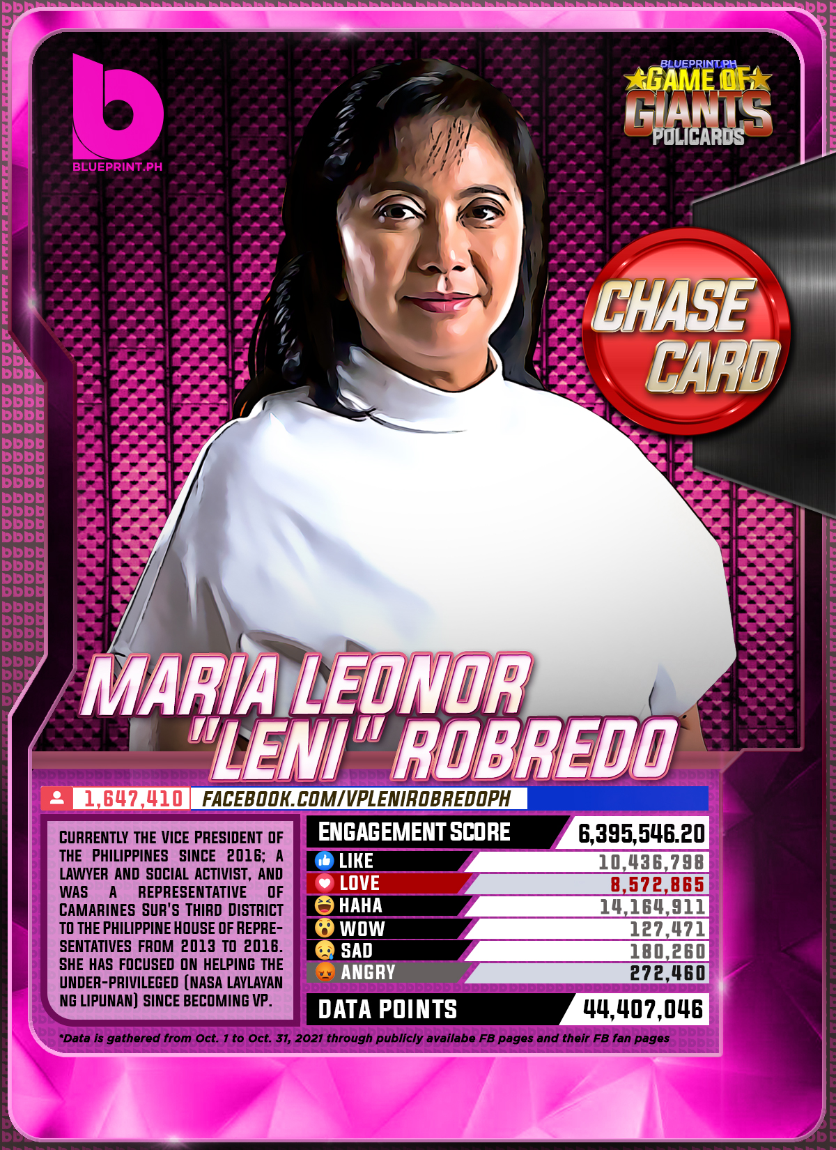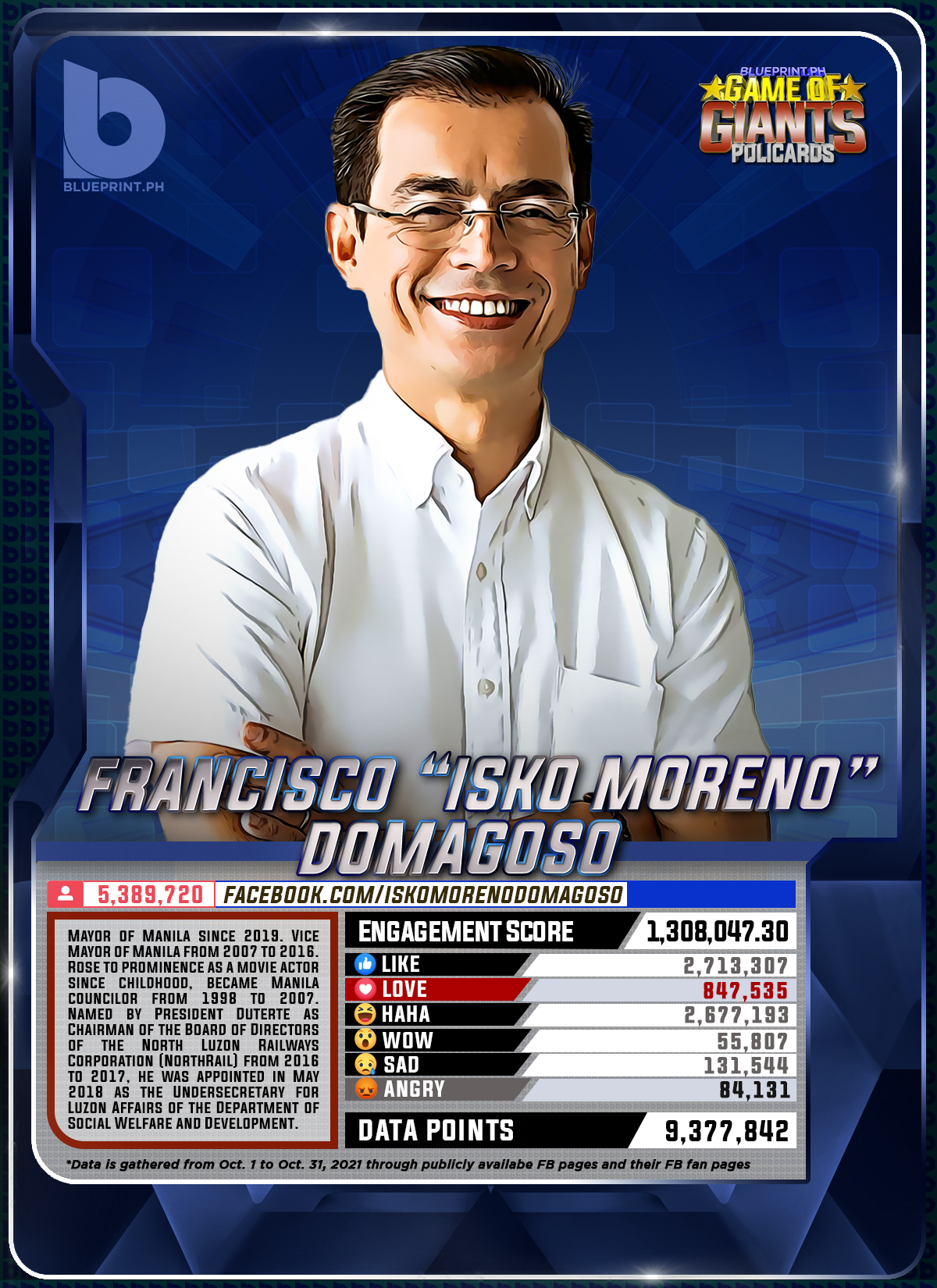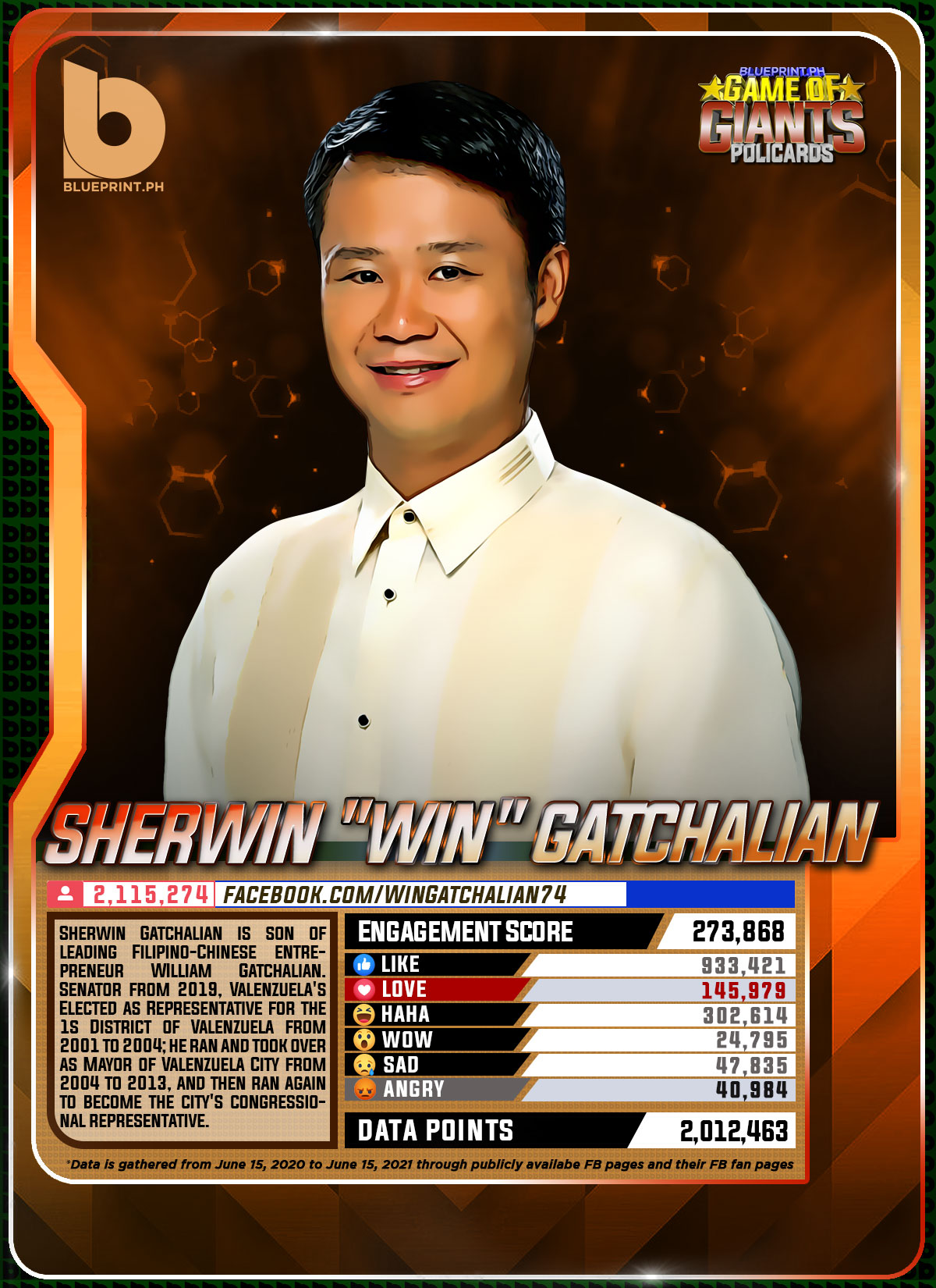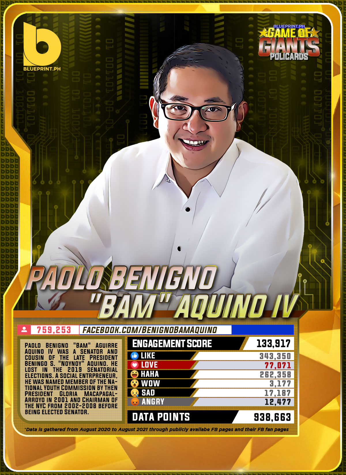 Using data from Filipinos' engagement in Facebook, we can now gauge public sentiment on issues and personalities,as shown by the big data analytics that political PR firm BluePrint.PH does regularly. And using that data, BluePrint.PH came up with a "policard" much like a baseball or an NBA card that shows sports players' scores, details about their life and other information which their fans can exchange. The cards themselves show public sentiment as measured through Filipinos' reaction to posts about them. To be updated every month, the prominent politicians can now be measured through the movement of n their social media engagement score.