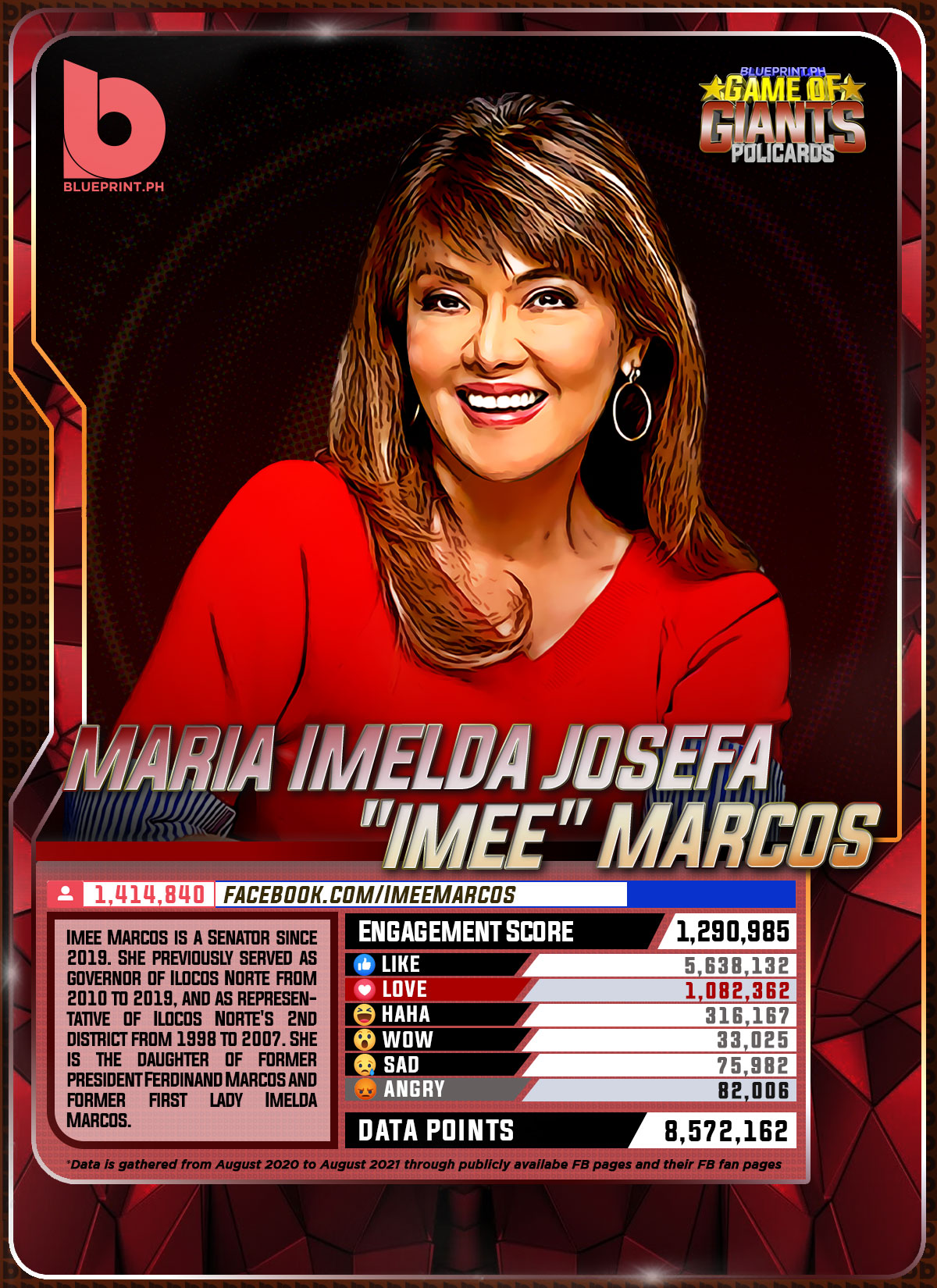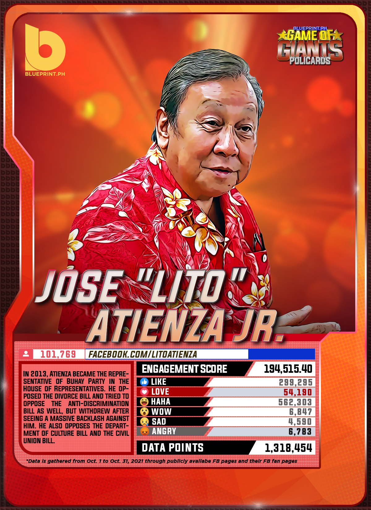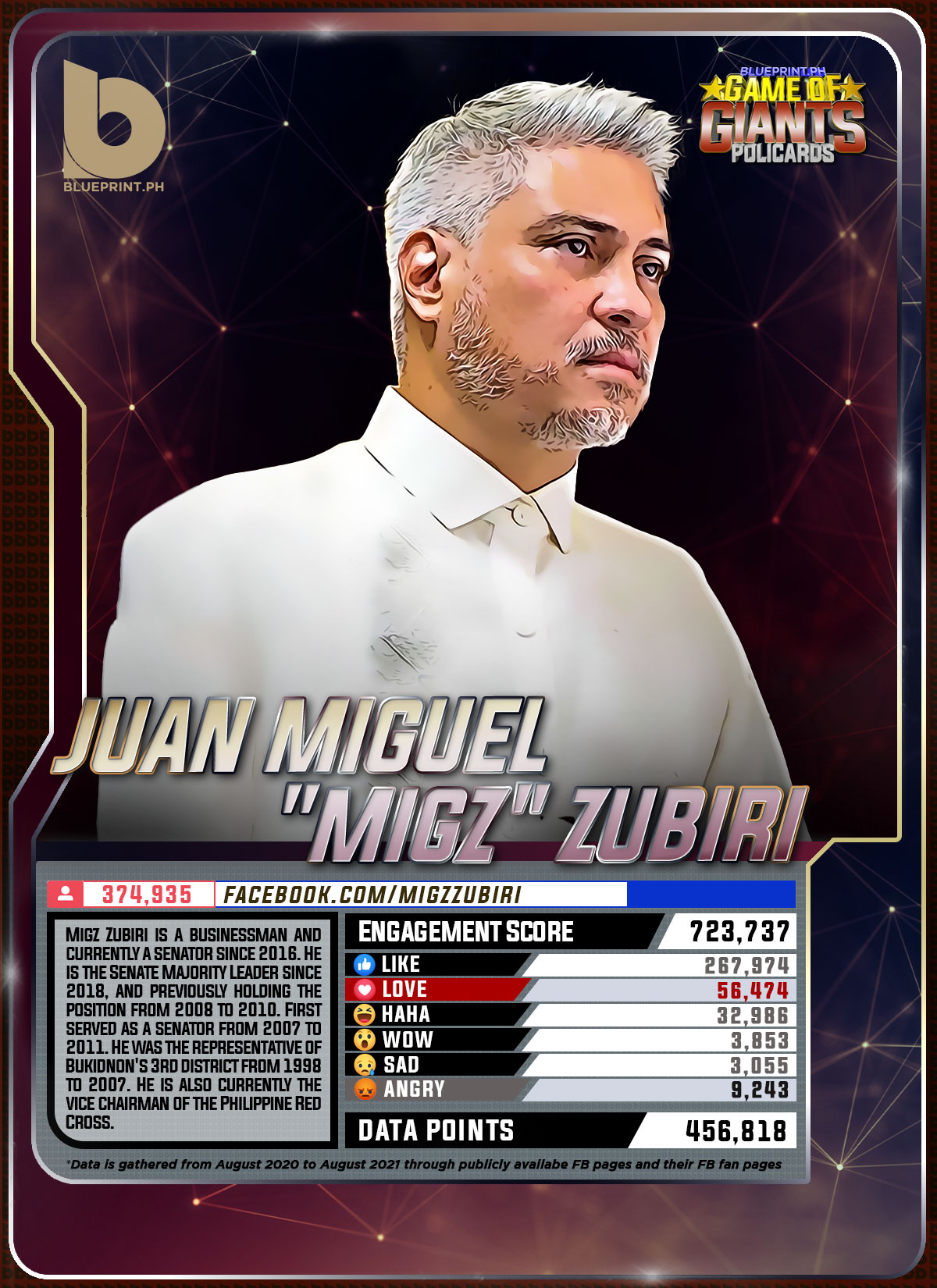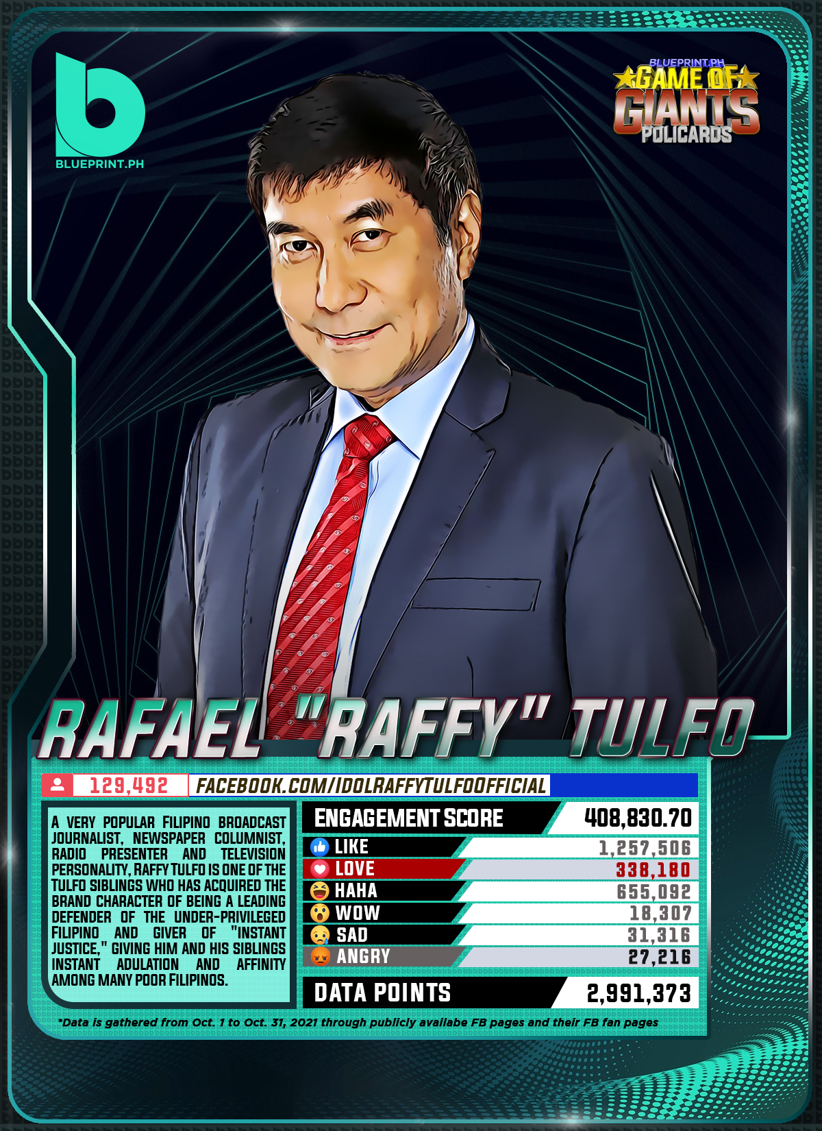 Using data from Filipinos' engagement in Facebook, we can now gauge public sentiment on issues and personalities,as shown by the big data analytics that political PR firm BluePrint.PH does regularly. And using that data, BluePrint.PH came up with a "policard" much like a baseball or an NBA card that shows sports players' scores, details about their life and other information which their fans can exchange. The cards themselves show public sentiment as measured through Filipinos' reaction to posts about them. To be updated every month, the prominent politicians can now be measured through the movement of n their social media engagement score.