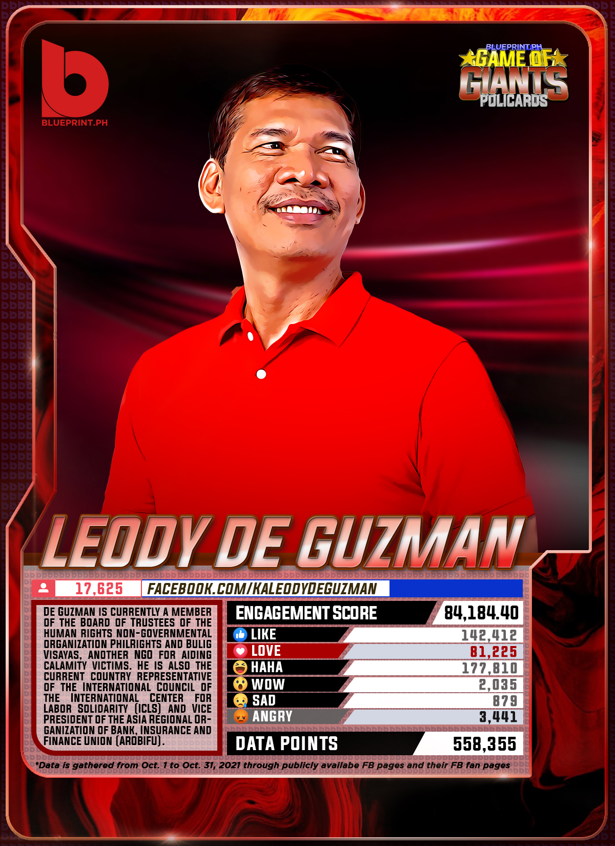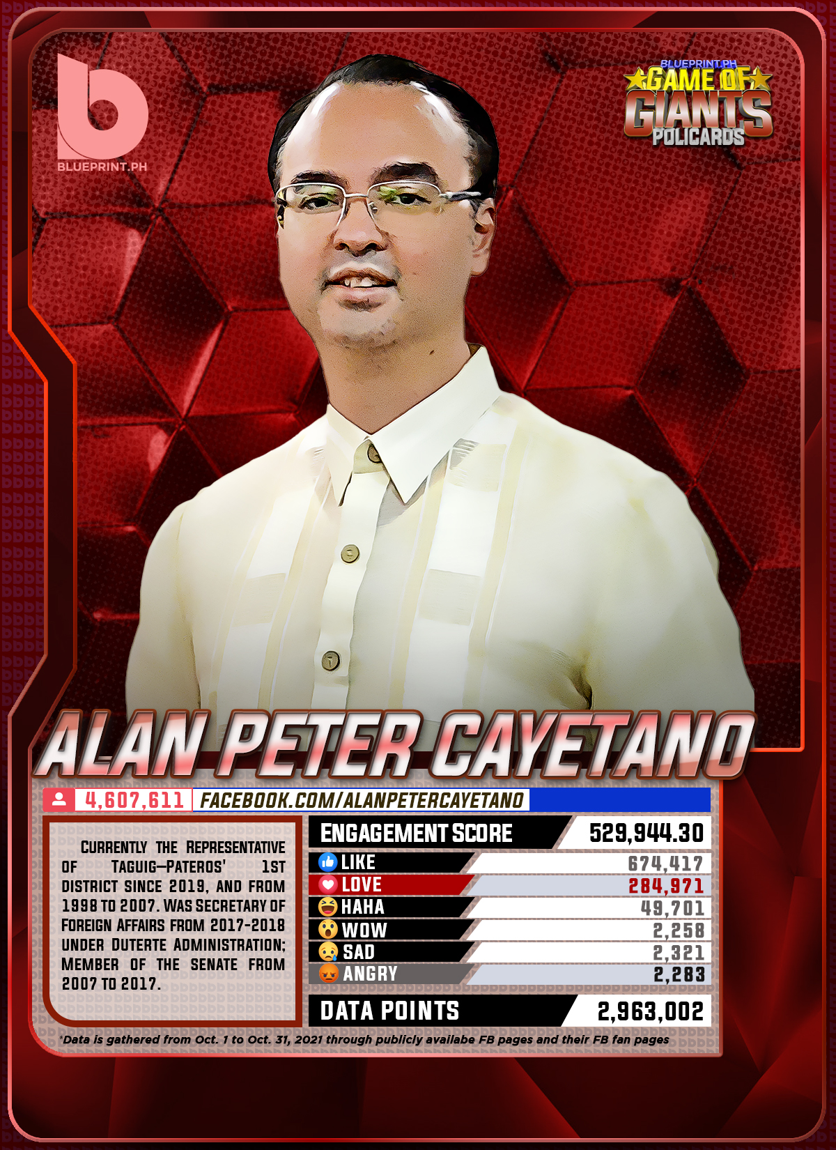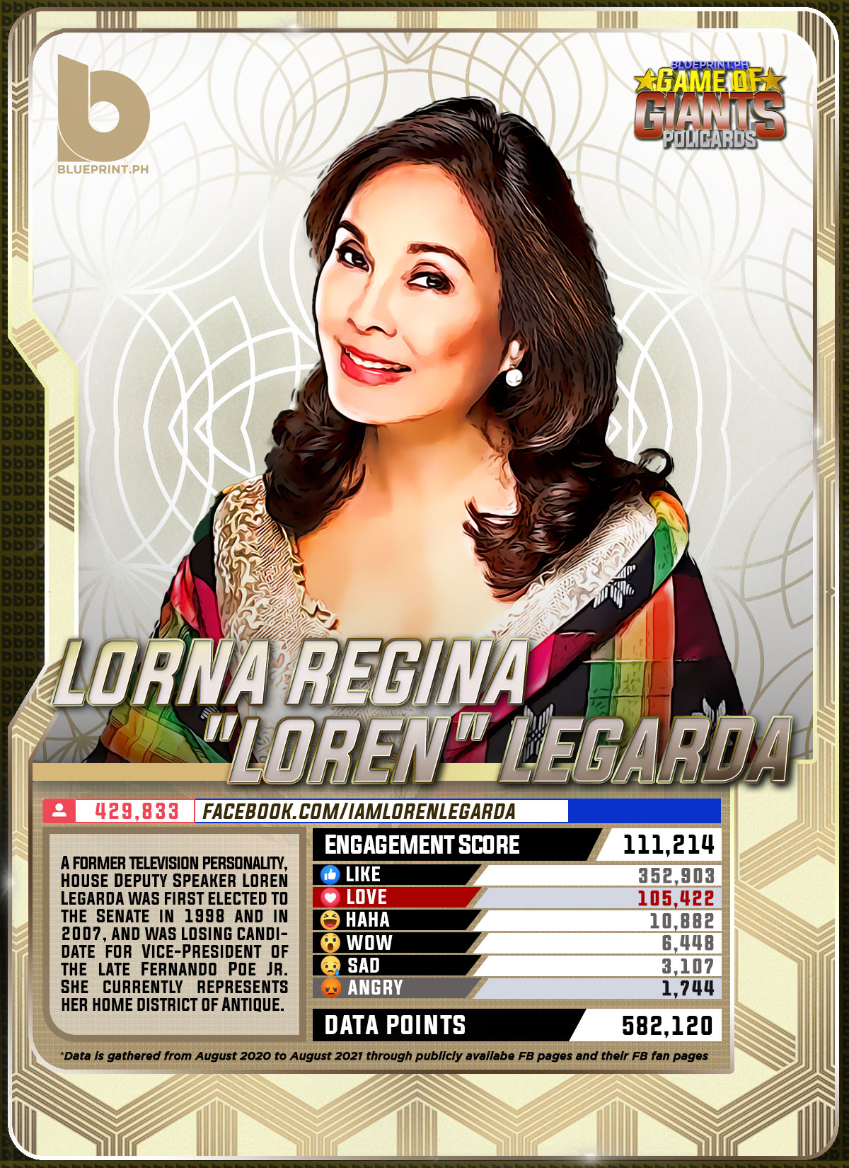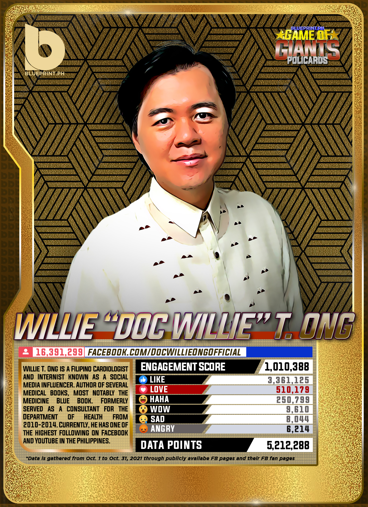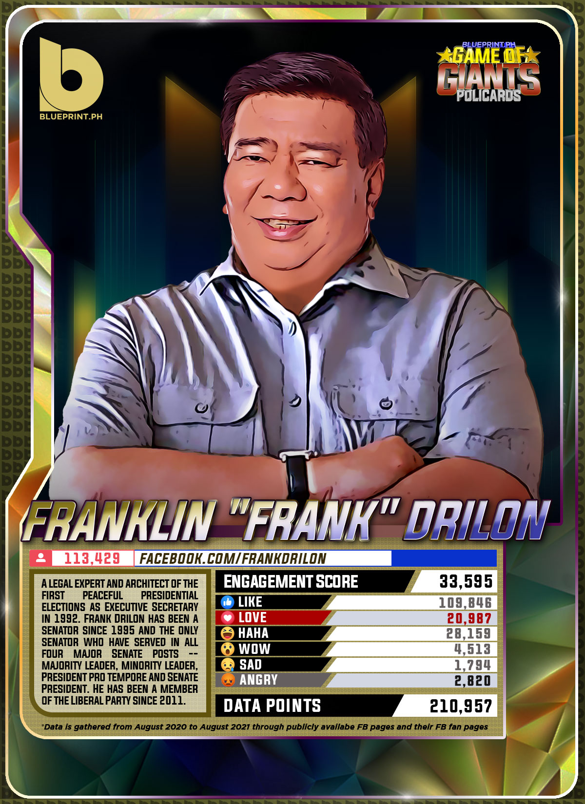 Using data from Filipinos' engagement in Facebook, we can now gauge public sentiment on issues and personalities,as shown by the big data analytics that political PR firm BluePrint.PH does regularly. And using that data, BluePrint.PH came up with a "policard" much like a baseball or an NBA card that shows sports players' scores, details about their life and other information which their fans can exchange. The cards themselves show public sentiment as measured through Filipinos' reaction to posts about them. To be updated every month, the prominent politicians can now be measured through the movement of n their social media engagement score.